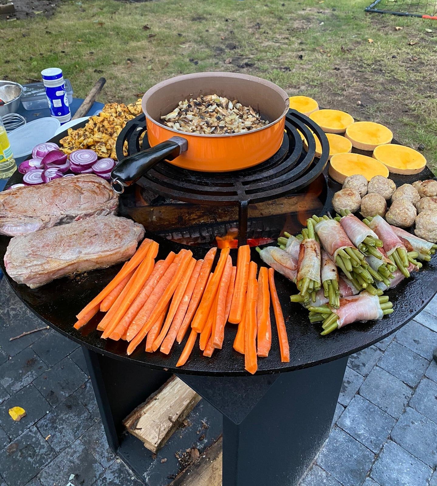 Deze uitvoering is ideaal als je graag je barbecue verplaatst en een werkblad naast het toestel hebt. de hardhouten planken (azobe of padouk) zijn behandeld een duurzame olie en er is een RVS plaat tussen het hout en de cone om gereedschap op te leggen. De afmetingen van deze bakplaat is net zoals bij het geba vuur groot 900 mm diameter en 10 mm dik.